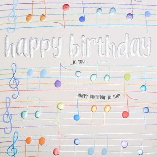 Say happy birthday with this playful birthday card embossed with colourful notes and blue treble clefs.Measurements:12.5cm x 12.5cm