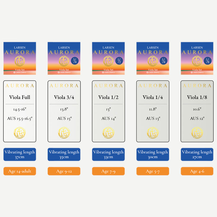 Which size of viola? Aurora strings for viola are available in full size and in fractional sizes 3/4, 1/2, 1/4 and 1/8. This guide indicates the manufactured design length intended to match the size options as displayed allowing for individual instrument variations. The age suggestions given are also intended for guidance only.