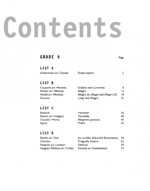 + Etude caprice (Goltermann arr. Cheney) + Study (Lee) + March of the wooden soldiers (Tchaikovsky arr. Mooney) + The drummers (Mooney) + Theme and variations I-VI (_ev_ik arr. Feuillard) + Siciliéne and La tromba (Couperin arr. Weretka) + Allegro (Mozart arr. Weretka) + Allegro (I), Adagio and Allegro (II) (Vivaldi arr. Weretka) + Largo and Allegro (Zocarini arr. Kolneder) + Hamabdil (Bantock) + Tarantella (Rossini arr. Hodgson) + Allegretto grazioso (Cassadó i Moreu) + Priére (Squire) + Joc cu bâta, Brâul and Buciumeana (Bartók arr. Chin) + Dragonfly dreams (Charlton) + Oblivion (Piazzolla arr. Lenehan) + Fantasia on Greensleeves (Vaughan Williams arr. Forbes)