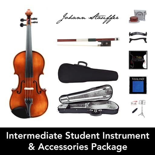 Instrument packages come with an instrument, bow and case. This package also comes with an accessories pack, with all the extra bits and pieces you'll need to play, including rosin, a shoulder rest, spare strings, a cleaning cloth, and a music stand.